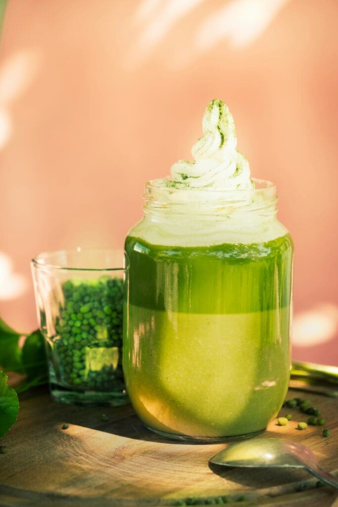 4. Vegane Schlagcreme mit Meerrettich zu einer festen Masse aufschlagen, in Spritztülle füllen und ein “Häubchen” auf den Smoothie setzen. Mit Spinatpulver und geriebener Zitronenschale bestreuen.