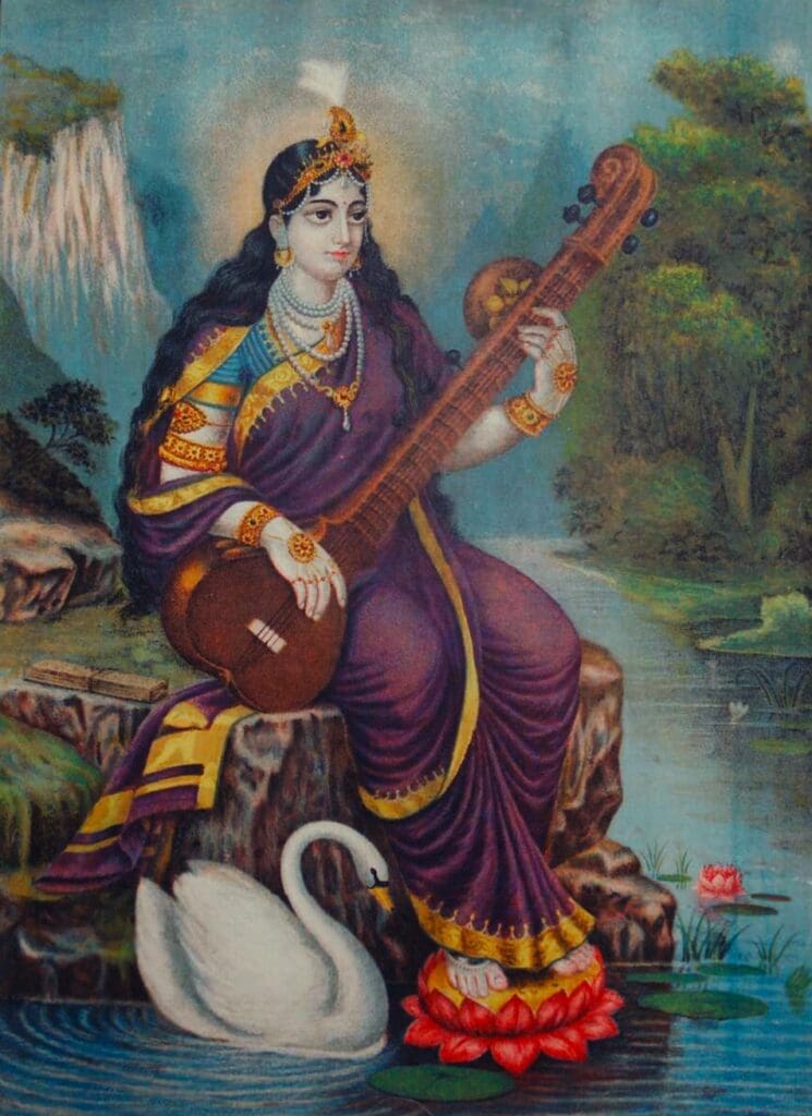 In der Ikonographie steht Sarasvati meist für sich: Auch wenn sie Brahma zugeordnet wird, ist sie ist keine brave Ehefrau, sondern eine jungfräuliche Künstlerin, Gelehrte und Weise, dargestellt als jugendliche Schöne, die mit offenen Haaren eine Vina, das indische Saiteninstrument, spielt. Sie ist die Göttin der Musik, der Sprache, der Poesie, der Kunst und des Wissens. Man könnte auch sagen: von allem, das in Zusammenhang, in Beziehung kommt. Sie gilt als die Weisheit selbst. Das Pulsieren von allem, das ist. Und obwohl Sarasvati mit dem Beginn des Schöpfungsprozesses assoziiert wird, ist sie in jedem Moment im Hier und Jetzt präsent: Sie ist in allem, was bereits harmonisch ist, ebenso wie in dem Moment, in dem etwas harmonisch wird. Auf Japanisch sagt man, dass es einen Klang gibt, wenn Harmonie entsteht, Hibiki – das ist Sarasvati.