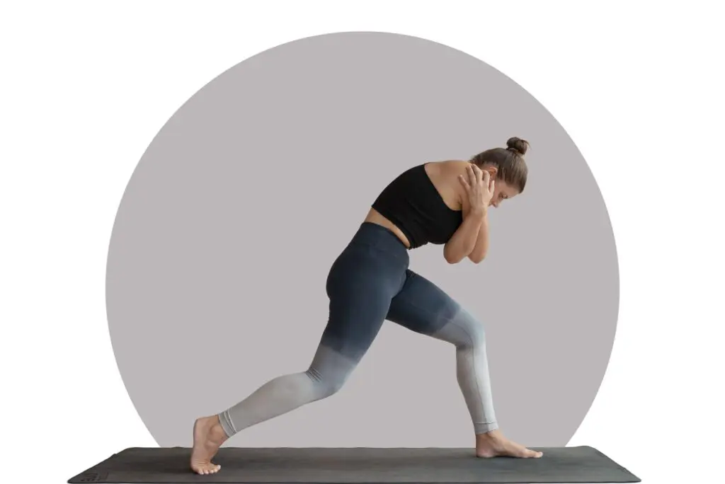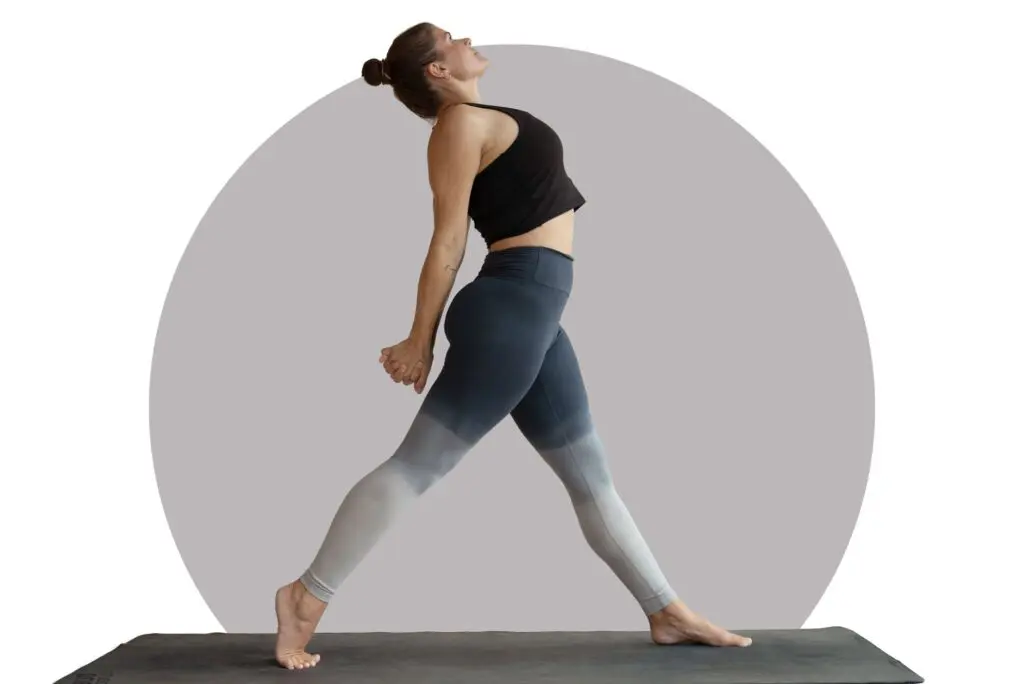Mache die Schritthaltung etwas enger und strecke beide Beine. Verschränke die Hände hinter dem Rücken, rolle die Schulterblätter zueinander und die Oberarme nach außen. Schiebe den großen Zeh des vorderen Fußes fest gegen die Matte, ziehe dein Brustbein nach oben und hebe den Blick. Spüre, wie das Licht in deinem Inneren zu strahlen beginnt. In ihm liegt Energie und Entschlossenheit, das Neue mit offenem Herzen zu begrüßen.