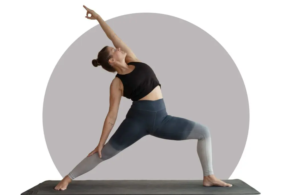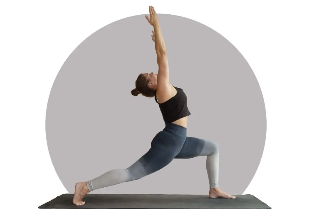Richte den Oberkörper mit einer Einatmung wieder auf, löse die Hände und wende dich zum langen Mattenrand. Dabei beugst du dein vorderes Knie, drehst den hinteren Fuß und setzt ihn flach auf die Matte. Strecke deine Arme auf Schulterhöhe zu den Seiten aus (Krieger 2). Mit einer Einatmung bewegst du die Arme wie Windmühlenflügel noch oben und hinten. Die rechte Hand liegt am hinteren Bein auf, der linken Arm zieht über den Kopf nach hinten in die Länge.