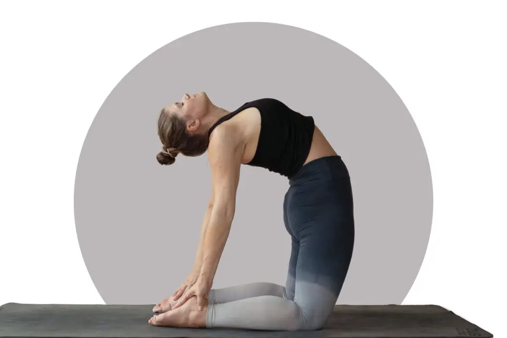 Auch dieser intensiven Rückbeuge, dem Kamel, solltest du dich vorsichtig annähern. Lege dazu im Kniestand beide Hände ans Kreuzbein, rolle die Schultern nach hinten und ziehe die Ellenbogen sanft zueinander. Aktiviere kraftvoll die Oberschenkel und den Beckenboden. Aus dieser stabilen Basis heraus hebst du einatmend dein Brustbein und bewegst dich von dort langsam und behutsam so weit in die Rückbeuge, wie es gut für dich ist. Wenn es mühelos möglich ist, kannst du die Hände an die Fersen legen. Spüre die Kraft in den Beinen und erlaube dem Feuer, in dir aufzusteigen.