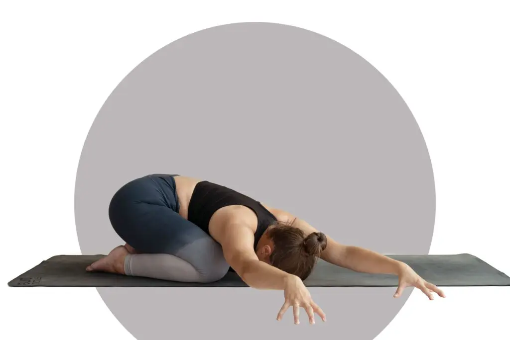 Setze dich auf die Fersen und öffne deine Knie leicht nach außen. Lege Oberkörper und Stirn nach vorne ab (gerne auch unterstützt von Kissen oder Bolster) und die Arme neben deinen Beinen nach hinten. Lasse die Stirn bewusst sinken und entspanne die Nackenmuskulatur. Vertiefe ein Gefühl von Einkehr und Erdung: Spüre den Boden unter dir und komme ganz bei dir, in deinem Körper, in diesem Moment an. (5–10 Atemzüge)